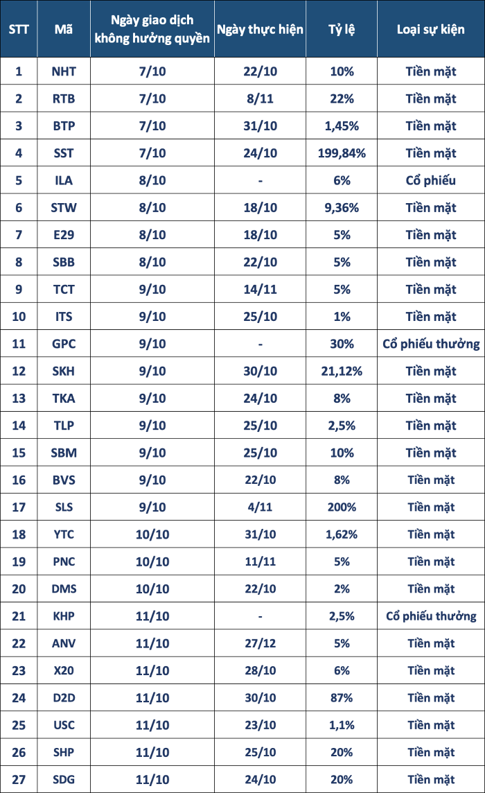 Tuần tới, từ 7/10 đến 11/0, thị trường chứng khoán có 27 doanh nghiệp chốt ngày giao dịch không hưởng quyền để nhận cổ tức tiền mặt, cổ phiếu.