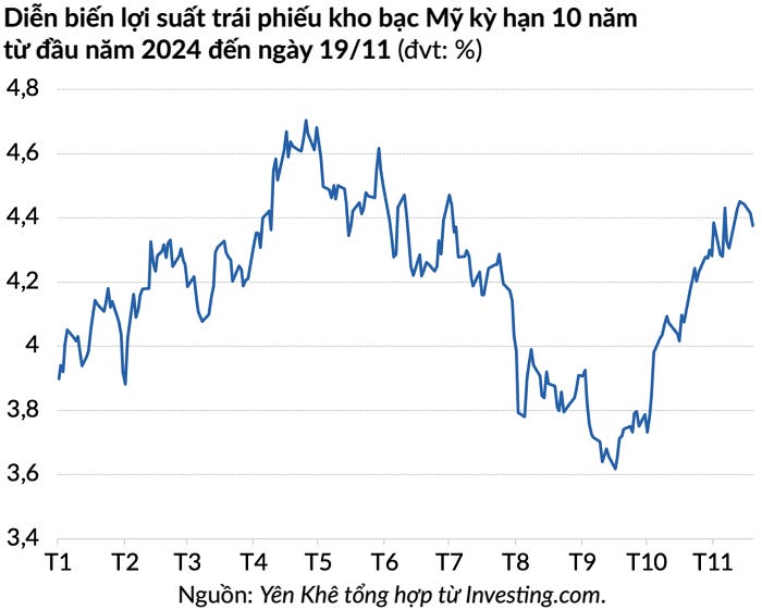 Lợi suất đã đi lên kể từ khi ông Trump chiến thắng cuộc bầu cử tổng thống. Ngay sau cuộc bỏ phiếu, lợi suất trái phiếu kho bạc kỳ hạn 10 năm đã vượt 4,4% để leo mức cao nhất kể từ đầu tháng 7.