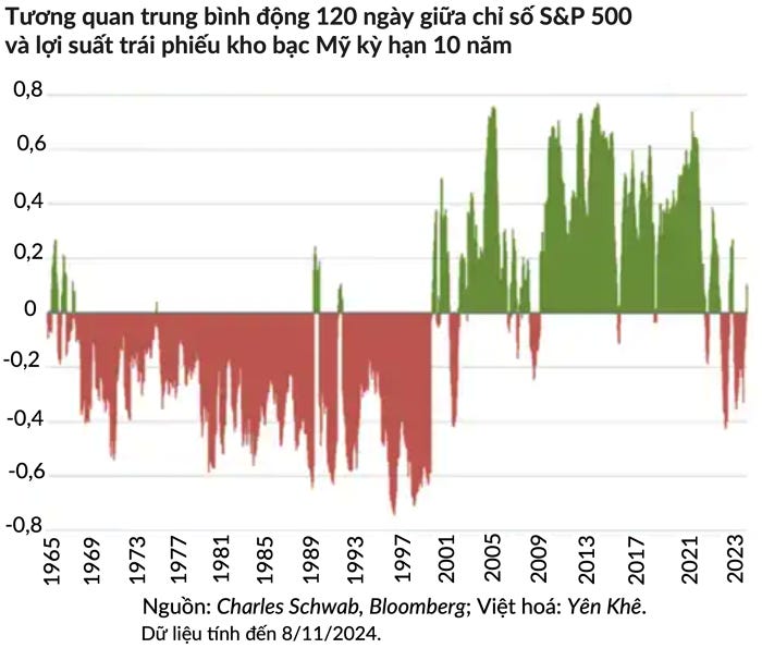 Tương quan trung bình động 120 ngày (rolling 120-day correlation) giữa chỉ số S&P 500 và lợi suất trái phiếu kho bạc kỳ hạn 10 năm đã quay trở lại mức dương. Điều này cho thấy cổ phiếu và lợi suất trái phiếu đang tăng cùng chiều khi các nhà đầu tư kỳ vọng nền kinh tế sẽ tiếp tục tăng trưởng mạnh mẽ.