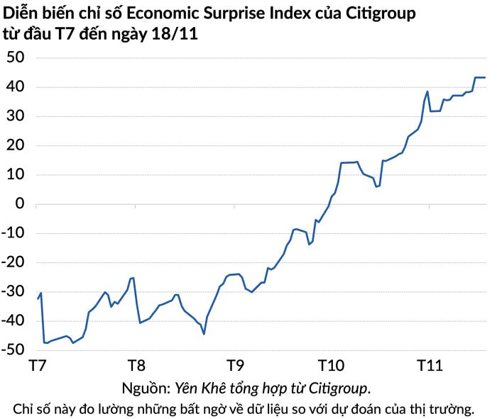 Chỉ số Economic Surprise Index (tạm dịch là chỉ số bất ngờ về nền kinh tế) của Citigroup đã tăng vọt trong những tháng gần đây, từ mức gần -50 vào mùa hè lên hơn 40 trong tháng 11.