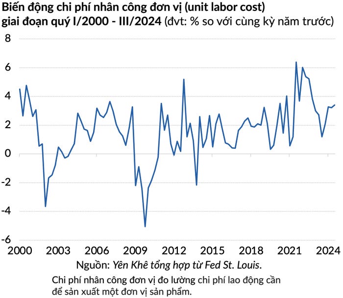 Chi phí lao động đã tăng tốc trong những tháng gần đây, các chiến lược gia lưu ý. Chi phí nhân công đơn vị (unit labor cost - tức chi phí lao động cần để sản xuất một đơn vị sản phẩm) tăng 3,4% so với cùng kỳ vào quý III, theo dữ liệu từ Fed.