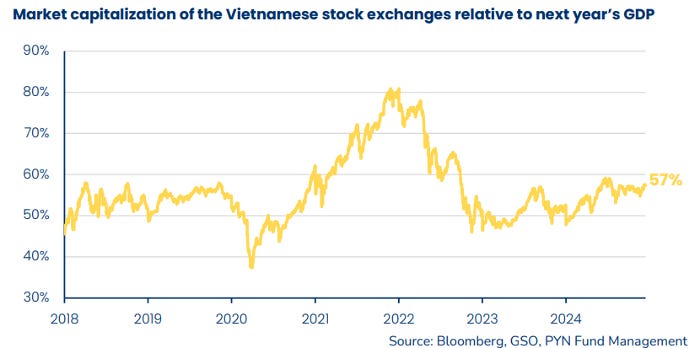 Vốn hóa thị trường kết hợp của sàn HOSE, HNX và thị trường UPCoM so với GDP vào năm 2025 dự kiến đạt tỷ lệ 57%, theo ông Petri Deryng là hợp lý. Nhà điều hành quỹ nhận định tỷ lệ này đối với thị trường chứng khoán của một nền kinh tế đang phát triển nhanh chóng có thể dễ dàng đạt mức gần 100%.