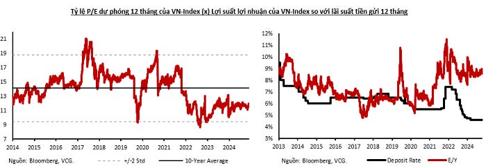 Về thị trường chứng khoán, P/E dự phóng năm 2024 là 11,8 lần, thấp hơn đáng kể so với mức trung bình năm 2018 (19 lần) và mức trung bình 5 năm (17,1 lần). P/E dự phóng năm 2025 ở mức khoảng 10 lần.