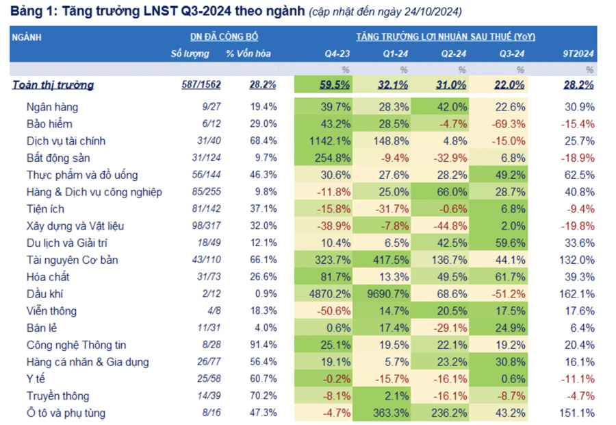 Tính đến ngày 24/10/2024 đã có 587 doanh nghiệp niêm yết đại diện 28,2% vốn hóa toàn thị trường công bố kết quả kinh doanh quý 3, bao gồm 9/27 Ngân hàng, 30/35 công ty chứng khoán và 541/1483 doanh nghiệp Phi tài chính, theo thống kê từ FiinTrade.
