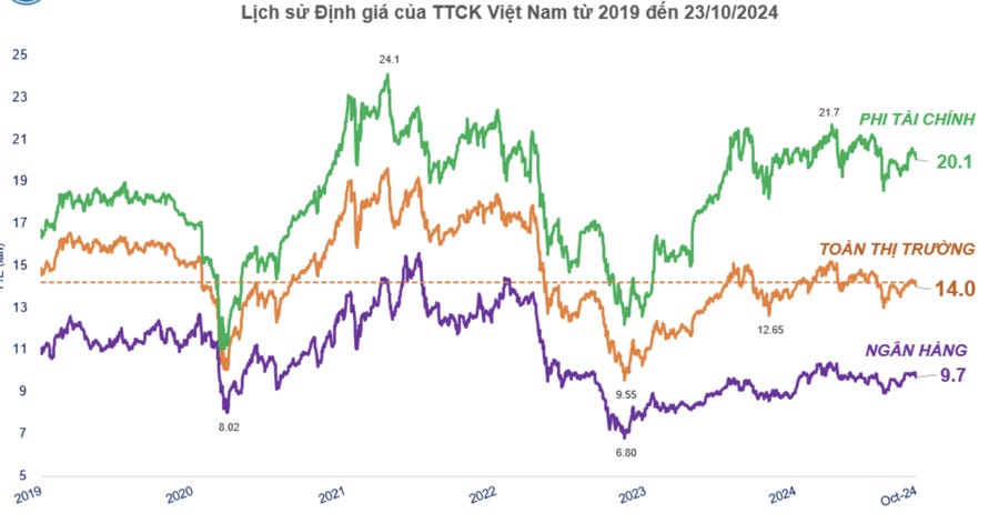 Hiện P/E toàn thị trường đang ở mức 14x, tương đương mức trung bình giai đoạn từ 2019 đến nay. Trong đó, P/E của Ngân hàng ở mức 9,7x, gần như đi ngang từ đầu 2024 đến nay, và Phi tài chính là 20x (cao hơn hơn so với trung bình 5 năm – 16,4x).