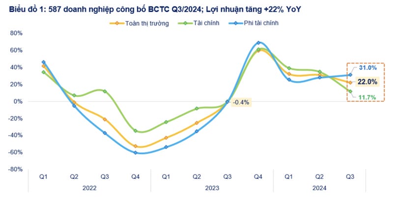 Tổng lợi nhuận sau thuế Q3/2024 của 587 doanh nghiệp duy trì tăng trưởng cao so với cùng kỳ tăng 22% nhưng giảm nhẹ 6% so với quý 2 trước đó, cho thấy đà hồi phục có dấu hiệu chững lại.