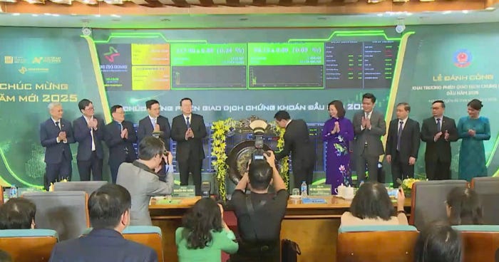 Sáng 2/1, tại Hà Nội, lãnh đạo Bộ Tài chính và các ban ngành liên quan đã tham dự buổi lễ đánh cồng khai trương phiên giao dịch chứng khoán đầu năm 2025. Lãnh đạo Ủy ban Chứng khoán Nhà nước đã nhận 6 chỉ đạo từ Bộ trưởng Tài chính Nguyễn Văn Thắng.