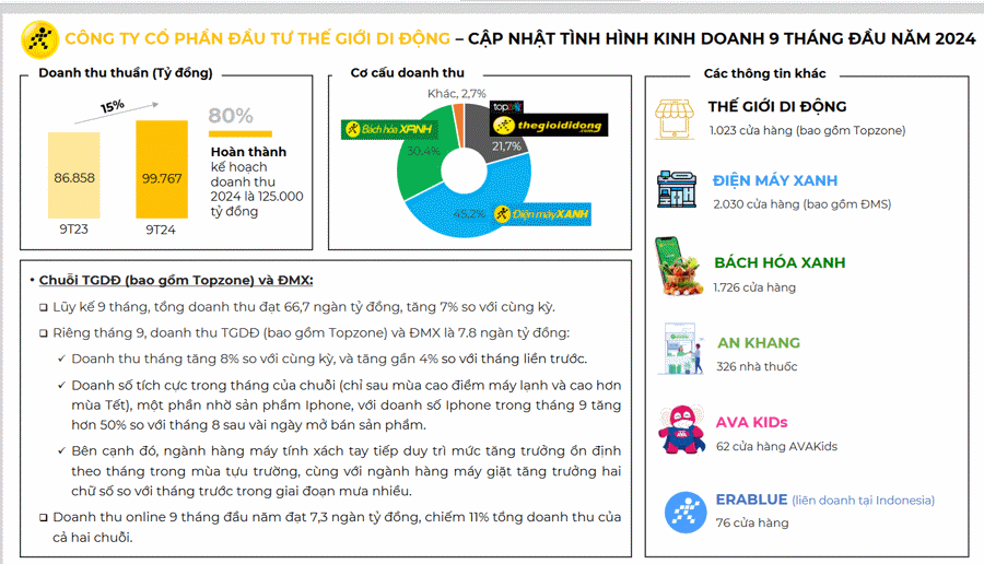Tính đến cuối tháng 9, công ty có 1.023 cửa hàng TGDĐ (bao gồm Topzone); 2.030 cửa hàng Điện Máy Xanh (bao gồm ĐMS); 1.726 cửa hàng Bách Hóa Xanh; 326 nhà thuốc An Khang; 62 cửa hàng AVAKids và 76 cửa hàng ERABLUE (liên doanh tại Indonesia.