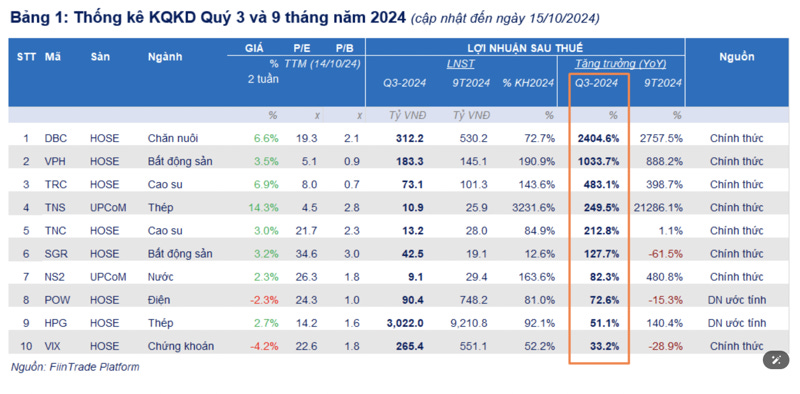 Tính đến ngày 15/10/2024 đã có 31 doanh nghiệp đầu tiên công bố kết quả kinh doanh quý 3, trong đó nhóm Thép, Chăn nuôi, Cao su chứng kiến lợi nhuận tăng trưởng đột biến so với cùng kỳ chủ yếu nhờ nền so sánh thấp, theo thống kê của FiinTrade.