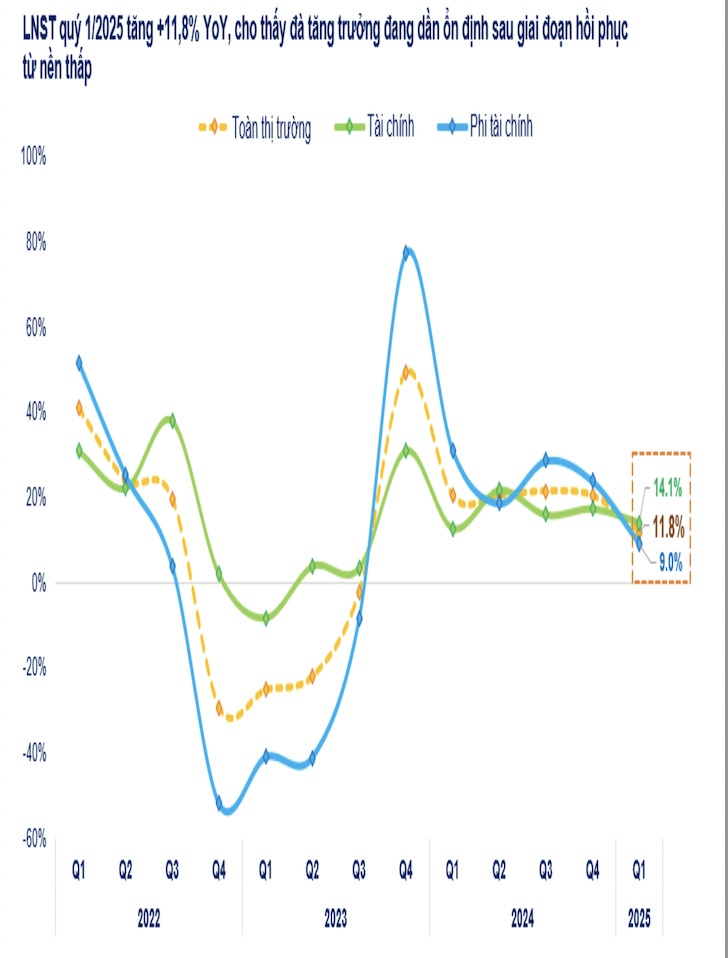 Nhóm Tài chính đóng vai trò chính trong việc duy trì đà tăng trưởng của toàn thị trường trong quý 1/2025 với lợi nhuận sau thuế tăng 14,1% so với cùng kỳ, chủ yếu nhờ vào Ngân hàng tăng 15,3%.