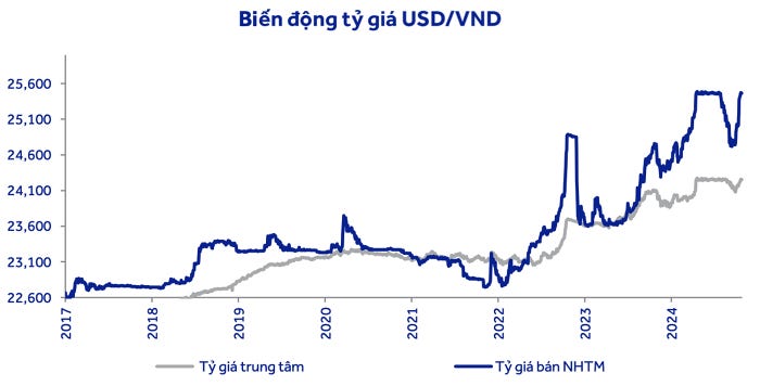 ACBS nhận định, VNĐ có khả năng đối mặt với áp lực giảm giá mạnh nếu Trump thắng cử và thực hiện những chính sách của mình (giảm thuế thu nhập doanh nghiệp, áp thuế suất nhập khẩu,…), vì những điều này củng cố giá trị đồng USD. Trong ngắn hạn, một đồng USD mạnh hơn sẽ làm tăng rủi ro giảm giá cho VNĐ.