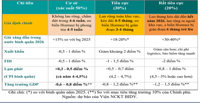 Ở kịch bản tiêu cực hơn, chiếm khoảng 30% khả năng xảy ra, xung đột lan rộng trong khu vực và kéo dài 4–5 tháng, khiến eo biển Hormuz bị gián đoạn trong 3–4 tháng. Áp lực lên giá năng lượng gia tăng rõ rệt, đẩy giá xăng dầu trong nước tăng khoảng 18–20% so với năm trước. Điều này kéo theo chi phí sản xuất và vận tải leo thang, khiến xuất khẩu giảm khoảng 2 điểm phần trăm. Dòng vốn FDI cũng bị ảnh hưởng mạnh hơn, giảm từ 1–1,5 điểm phần trăm khi nhà đầu tư trở nên thận trọng. Lạm phát theo đó tăng thêm 0,5– 0,7 %, đưa CPI bình quân lên khoảng 4,2–4,7%. Tăng trưởng GDP vì vậy có thể suy giảm từ 0,8–1,2 %.