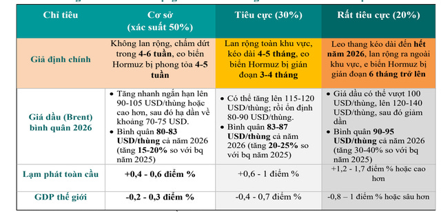 Trong kịch bản tiêu cực hơn, chiếm khoảng 30% khả năng xảy ra, xung đột lan rộng trong khu vực và kéo dài từ 4–5 tháng, khiến hoạt động tại eo biển Hormuz bị gián đoạn trong 3–4 tháng. Khi đó, nguồn cung dầu toàn cầu chịu áp lực lớn hơn, đẩy giá Brent có thể vọt lên 115–120 USD/thùng trước khi dần ổn định ở mức 80–90 USD/thùng. Giá bình quân năm theo đó tăng lên 83–87 USD/thùng, tương đương mức tăng 20–25% so với năm 2025. Hệ quả là áp lực lạm phát gia tăng rõ rệt hơn, khoảng 0,6–1%, đồng thời kéo giảm tăng trưởng kinh tế toàn cầu từ 0,4–0,7%.