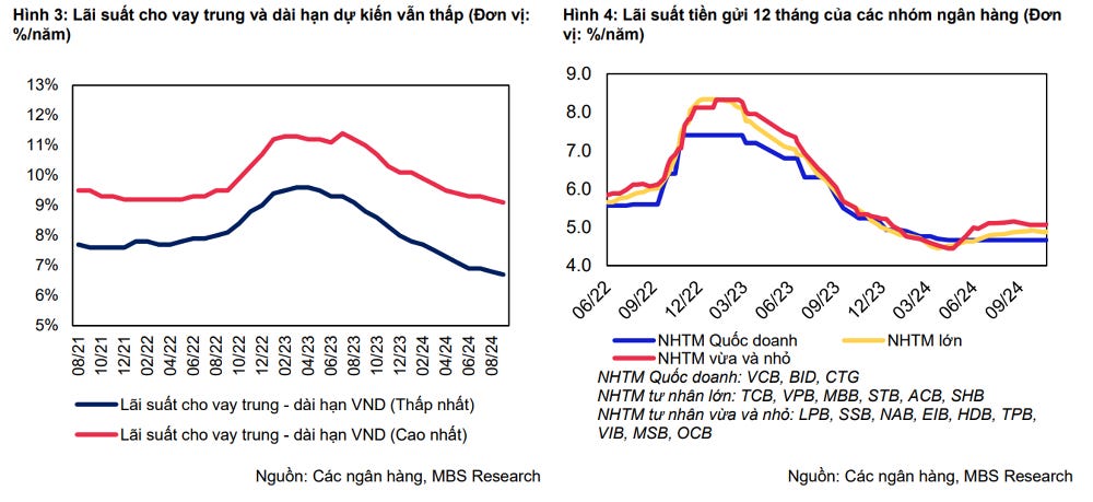 Theo đó, liên quan đến lãi suất, từ đầu năm 2023, Ngân hàng Nhà nước (NHNN) đã giảm lãi suất điều hành 4 lần, đưa lãi suất tái cấp vốn hiện tại xuống mức 4,5% (thấp hơn cả giai đoạn COVID-19 năm 2020). Lãi suất cho vay trung và dài hạn hiện dao động quanh mức 6,7 - 9,1% (thời điểm giữa năm 2023 dao động trong khoảng 9,3 - 11,4%).