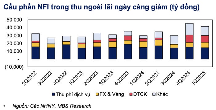 Theo MBS, sự sụt giảm mạnh của thu nhập phí thuần (NFI) là yếu tố chính khiến thu nhập ngoài lãi tăng trưởng chậm lại đáng kể trong hai năm vừa qua.