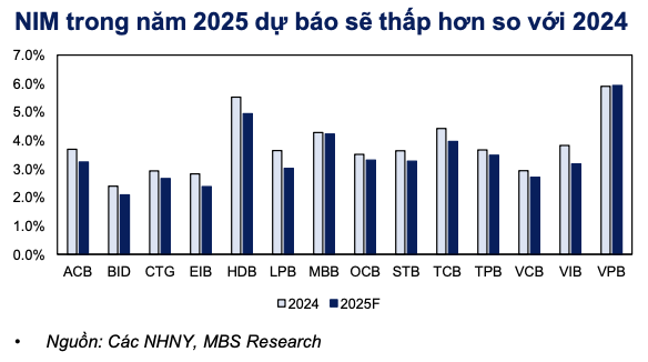 Bất chấp xu hướng chung giảm, MBS nhận định sẽ có sự khác biệt rõ rệt giữa các ngân hàng về NIM. Những ngân hàng từng ghi nhận mức giảm NIM mạnh trong những năm gần đây — do đặcthù danh mục cho vay bị ảnh hưởng, chẳng hạn như VPBank, MB và Techcombank được kỳ vọng sẽ có mức giảm NIM nhẹ hơn so với các ngân hàng khác.