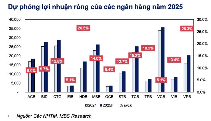 Lợi nhuận ròng toàn ngành (nhóm ngân hàng theo dõi) được dự báo tăng 13,5% trong năm 2025. Trong đó, nhóm ngân hàng tư nhân sẽ tiếp tục dẫn đầu, dự kiến tăng trưởng lợi nhuận 25,9%, cao gấp ba lần nhóm quốc doanh (8,8%).
