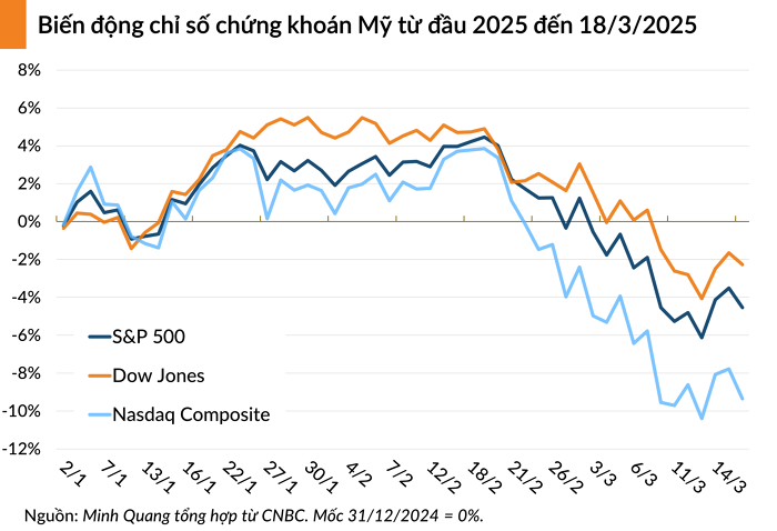 Theo CNBC, trong phiên giao dịch ngày 18/3, chỉ số trung bình công nghiệp Dow Jones đã mất 260 điểm, tương đương 0,62% và đóng cửa ở mức 41.581 điểm. Chỉ số S&P 500 giảm 1,07% xuống 5.615 điểm và lại một lần nữa tiến gần đến vùng điều chỉnh. Nasdaq Composite tụt 1,71% và chốt phiên ở mức 17.504 điểm.
