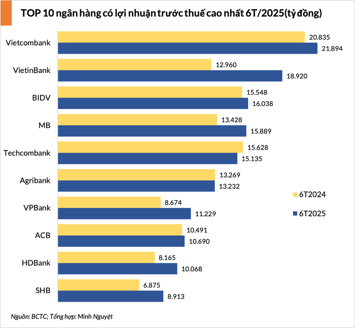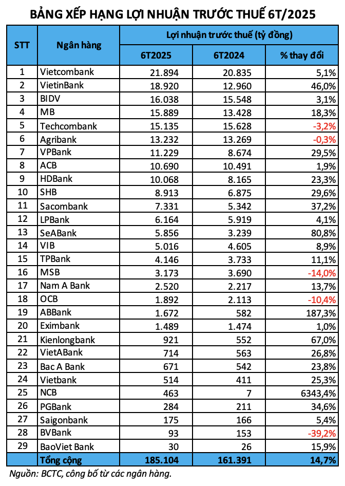 Bảng xếp hạng lợi nhuận ngân hàng nửa đầu năm 2025: VietinBank bứt phá lên Top 2, MB vượt Techcombank dẫn đầu nhóm cổ phần