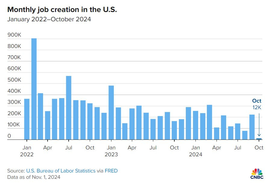 Ngày 1/11, Cục Thống kê Lao động (BLS) Mỹ báo cáo số việc làm phi nông nghiệp tăng 12.000 trong tháng 10, giảm mạnh so với tháng 9 và thấp hơn nhiều so ước tính của Dow Jones là 100.000 việc làm mới. Đây là mức tăng ít nhất kể từ tháng 12 năm 2020.