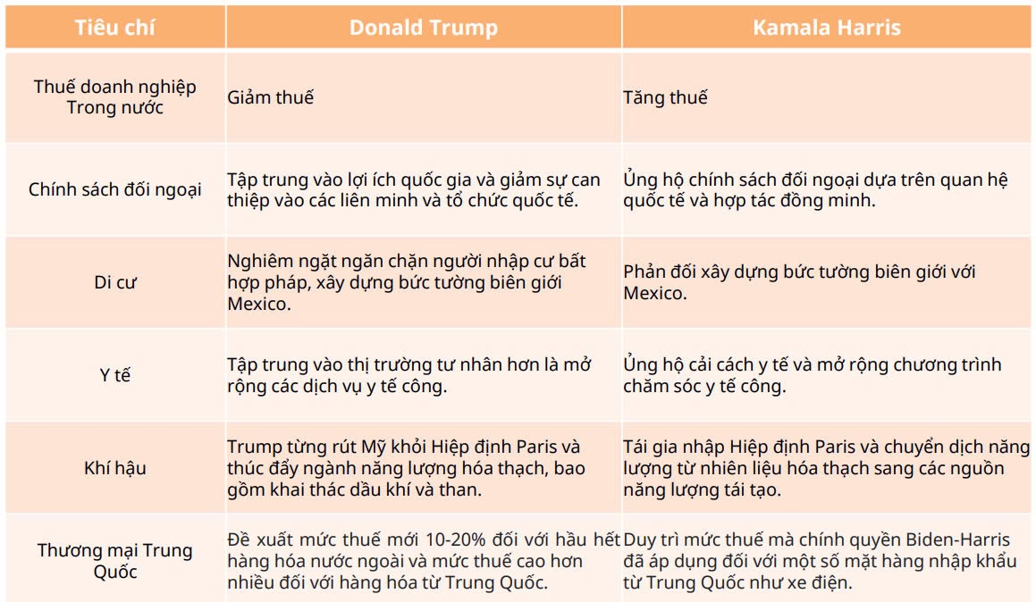 Chứng khoán Mirae Asset nhận thấy có nhiều điểm khác biệt về chính sách giữa 2 ứng cử viên, nhưng đều tập trung chủ yếu vào các vấn đề: thuế, lạm phát, thương mại Mỹ - Trung, người nhập cư, luật về nạn phá thai, chiến tranh tại Ukraine và môi trường... Nhìn chung, bà Kamala Harris theo đuổi thương mại tự do, chú trọng hợp tác quốc tế và duy trì nhiều chính sách dưới thời ông Biden. Trong khi đó, ông Donald Trump ủng hộ thương mại song phương, tập trung bảo vệ ngành công nghiệp trong nước.