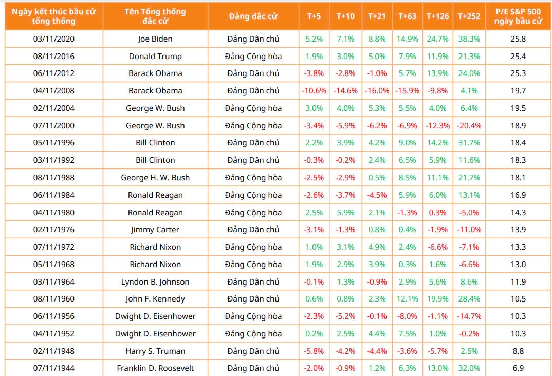 Dựa trên số liệu thống kê lịch sử 20 cuộc bầu cử tổng thống gần nhất từ năm 1944 - 2020, diễn biến thị trường chứng khoán Mỹ có sự phân hóa giữa 2 đảng Dân chủ và Cộng hòa sau ngày kết thúc bầu cử. Cụ thể, khi đảng Dân chủ đắc cử, chỉ số S&P 500 trung bình tăng 3,8% sau 3 tháng, tăng 8% sau 6 tháng và tăng 17% sau 1 năm. Khi đảng Cộng hòa đắc cử, chỉ số S&P 500 tăng 0,37% sau T+10, tăng 1,52% sau 1 tháng, tăng 2,17% sau 3 tháng; nhưng chỉ tăng 1,59% sau nửa năm và tăng 0,83% sau 1 năm.