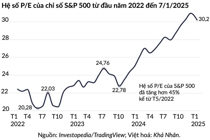 Đồ thị bên dưới kể một câu chuyện ấn tượng về thị trường chứng khoán Mỹ kể từ năm 2022. Định giá cổ phiếu tính đến ngày 7/1/2025 đang cao hơn khoảng 67% so với mức trung bình lịch sử và hơn gần 50% so với đầu năm 2022.