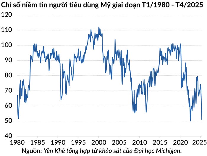 Trong năm 2025, rõ ràng là niềm tin của người Mỹ vào nền kinh tế đang nhanh chóng xấu đi. Chỉ số tâm lý người tiêu dùng của Đại học Michigan đã rơi xuống mức thấp nhất trong gần 4 thập kỷ vào tháng 4.