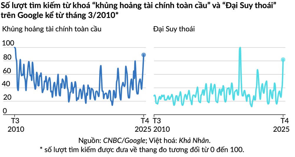 Google dự đoán lượt tìm kiếm liên quan đến khủng hoảng tài chính năm 2008 sẽ tăng đột biến trong tháng này. Các lượt tìm kiếm về “khủng hoảng tài chính toàn cầu” dự kiến sẽ đạt mức cao chưa từng thấy kể từ năm 2010, trong khi các lượt tìm kiếm về “Đại Suy thoái” dự kiến sẽ đạt đỉnh kể từ đại dịch COVID-19.