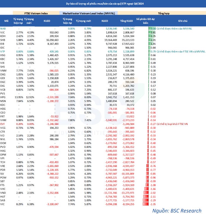 Tổng hợp cả hai ETF, BSC dự báo trong đợt cơ cấu quý IV, các mã có thể được mua vào nhiều nhất theo khối lượng gồm SHB (35,2 triệu cp), EIB (17,9 triệu cp), VIX (9 triệu cp), NAB (5,5 triệu cp), KDH (5 triệu cp), KBC (4,7 triệu cp), DXG (4,1 triệu cp)...
