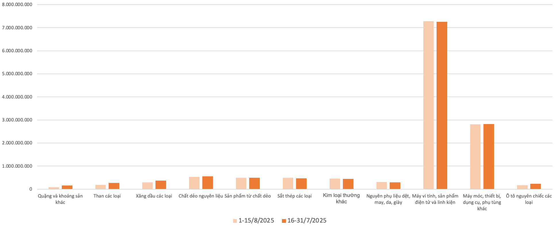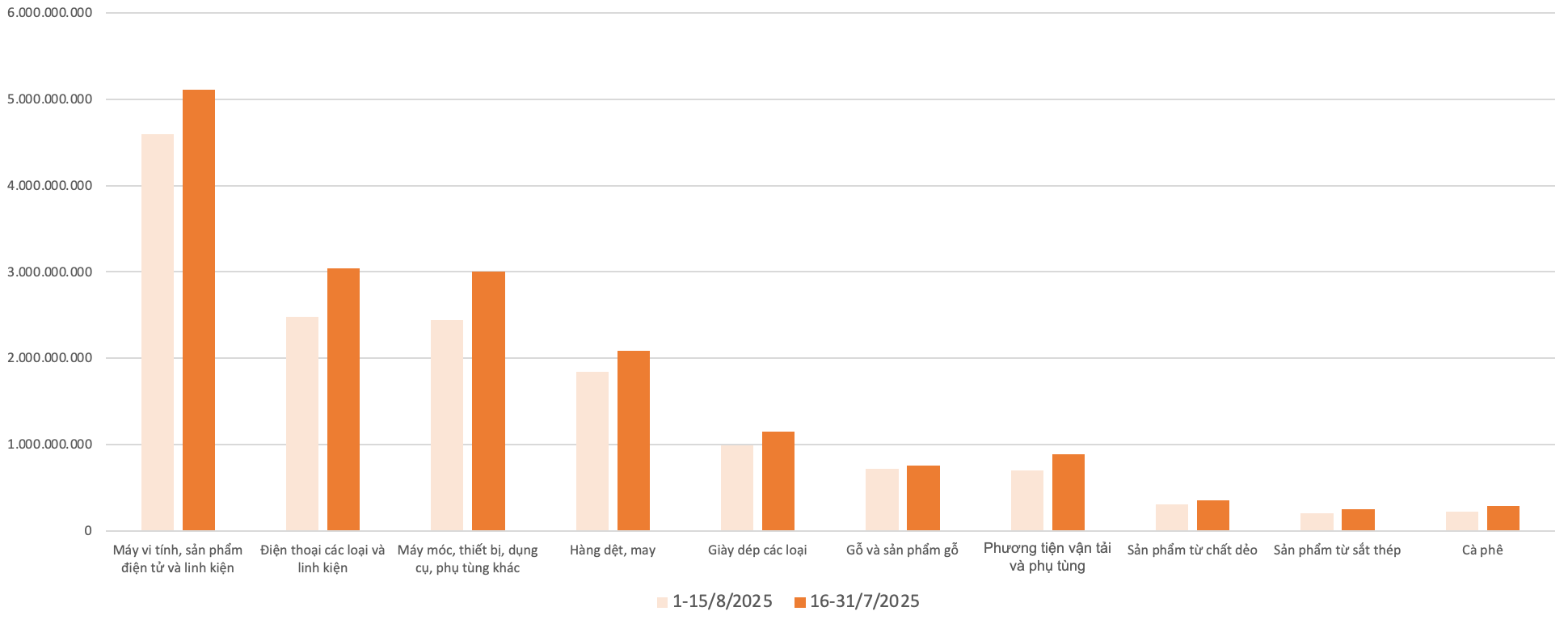 Luỹ kế từ đầu năm đến ngày 15/8, tổng trị giá xuất khẩu của Việt Nam đạt 282,62 tỷ USD, tăng 15,04%, tương ứng tăng 36,95 tỷ USD so với cùng kỳ năm 2024. Trong đó, 5 nhóm hàng bao gồm: máy vi tính, sản phẩm điện tử và linh kiện; máy móc, thiết bị, dụng cụ phụ tùng khác; đồ chơi, dụng cụ thể thao; cà phê; hàng dệt may; phương tiện vận tải và phụ tùng; giày dép giữ vai trò chủ đạo đóng góp vào đà tăng trong 8 tháng đầu năm với mức tăng lần lượt là 18,33 tỷ USD (42,64%); 4,49 tỷ USD (14,87%); 2,71 tỷ USD (120,36%); 2,41 tỷ USD (62,77%); 2,25 tỷ USD (10,13%); 1,31 tỷ USD (14,05%) và 1,16 tỷ USD (8,33%).