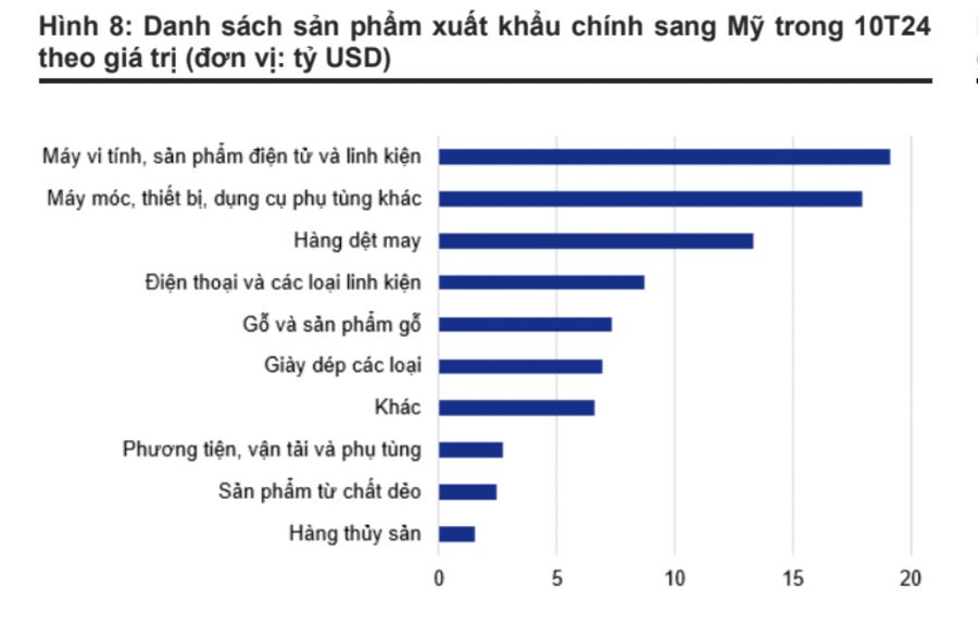 VnDirect đánh giá tác động tiềm tàng của việc tăng thuế (nếu xảy ra) đối với sáu nhóm hàng xuất khẩu chính từ Việt Nam sang Mỹ: sản phẩm điện tử, dệt may và da giày, máy móc & thiết bị, gỗ & sản phẩm gỗ, thủy sản và Sắt thép các loại. Các mặt hàng này chiếm gần 80% giá trị nhập khẩu của Mỹ từ Việt Nam vào năm 2023.