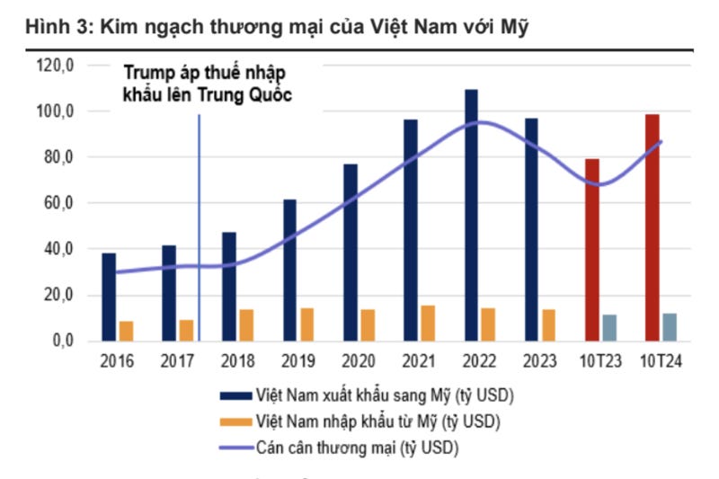 Theo VnDirect, việc áp thuế nhập khẩu có thể gia tăng áp lực lên lạm phát Mỹ, đè nặng lên nhu cầu tiêu dùng, qua đó ảnh hưởng đến triển vọng xuất khẩu của Việt Nam khi Mỹ là thị trường xuất khẩu lớn nhất, chiếm khoảng 29% kim ngạch xuất khẩu của Việt Nam.