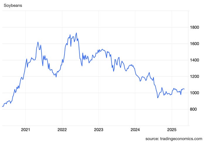Giá đậu tương giảm trong bối cảnh Trung Quốc áp mức thuế cao ngất ngưởng đối với Mỹ. Năm ngoái, Trung Quốc là “khách hàng” lớn mua ngô và đậu tương của Mỹ. Do đó, cuộc chiến thuế quan đã tác động lớn đến giá mặt hàng này.