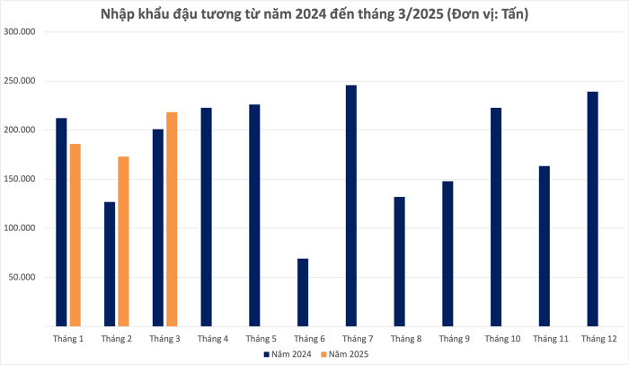 Trong năm 2024, Việt Nam nhập khẩu hơn 2,2 triệu tấn đậu nành, tăng 19% so với năm trước đó. Trong quý I, xu hướng vẫn tiếp tục tăng lên khi lượng nhập đạt hơn 576.000 tấn đậu nành, tăng gần 7% so với cùng kỳ năm ngoái.
