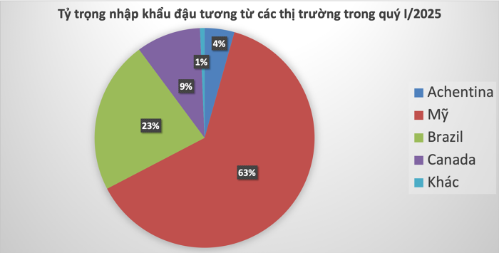 Trong số các thị trường cung cấp đậu nành cho Việt Nam, Mỹ chiếm tỷ trọng lớn nhất lên tới 63%. Theo đó, trong quý I, lượng nhập khẩu đậu nành từ Mỹ tăng mạnh 55% lên gần 363.000 tấn.
