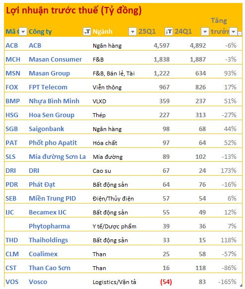 Masan High-Tech Materials (MHT): Doanh thu đạt 1.393 tỷ đồng, tăng 12,0% so với doanh thu LFL quý 1/2024 của MHT; NPAT Pre-MI âm 222 tỷ đồng, cải thiện 480 tỷ đồng nhờ thoái vốn tại H.C. Starck (HCS) và giá khoáng sản tăng mạnh do căng thẳng thương mại giữa Mỹ và Trung Quốc.