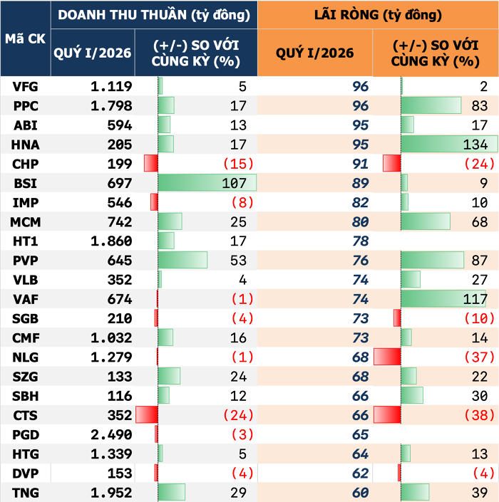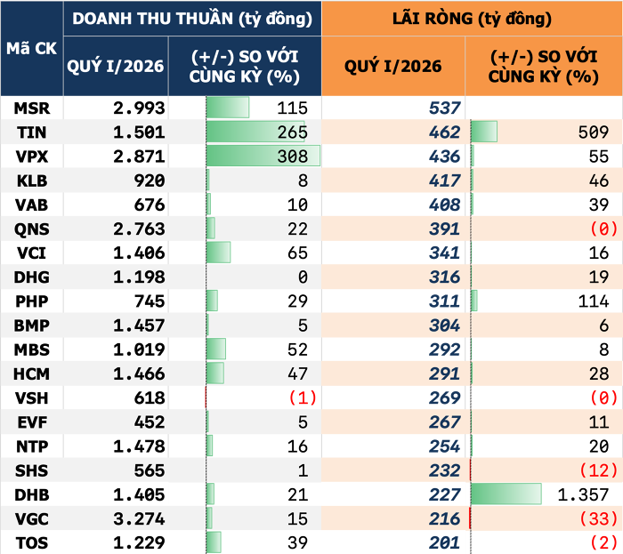 Một số công ty có mức tăng lợi nhuận bằng lần trong quý đầu năm như: MSN, MSR, CTD, NT2, SJS, PHP, DHB,...