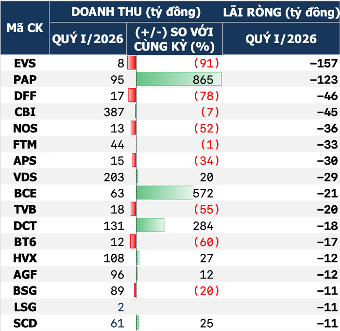 Tính tới sáng 28/4 có 71 doanh nghiệp báo lỗ quý I. Một số khoản lỗ lớn quý đầu năm như: EVS (-157 tỷ), PAP (-123 tỷ), DFF (-46 tỷ), CBI (-45 tỷ), NOS (-36 tỷ),...