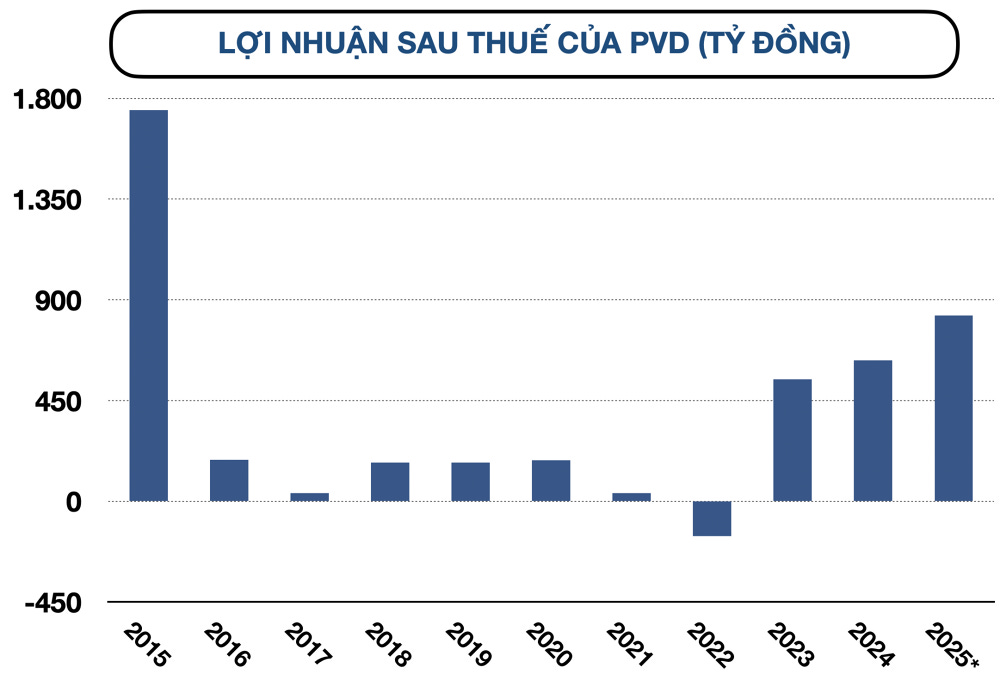 Đối với nhóm thượng nguồn, tổng doanh thu năm 2025 của Tổng CTCP Khoan và Dịch vụ Khoan Dầu khí (Mã: PVD) khoảng 10.500 tỷ đồng, tăng 10% so với năm trước. Lợi nhuận sau thuế ước khoảng 830 tỷ đồng, cao hơn 19% so với năm 2024. Đây cũng là mức lợi nhuận cao nhất trong vòng 10 năm trở lại đây của PVD.