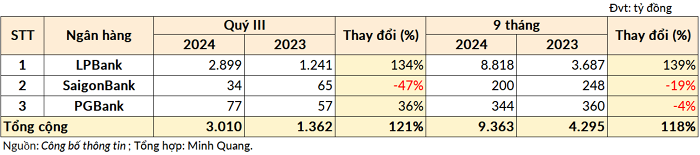 Tính đến sáng ngày 19/10, đã có ba ngân hàng công bố kết quả kinh doanh quý III và 9 tháng đầu năm 2024. Cụ thể, một ngân hàng ghi nhận lợi nhuận gấp hơn hai lần cùng kỳ, một ngân hàng báo lãi tăng hai con số trong khi ngân hàng còn lại báo lãi giảm với cùng kỳ.