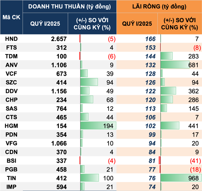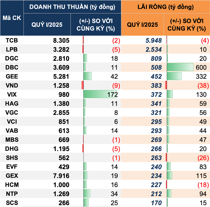 Nhiều doanh nghiệp lớn ghi nhận lợi nhuận sau thuế của cổ đông công ty mẹ (lợi nhuận ròng) tăng trưởng hai chữ số như LPBank (Mã: LPB), Hoá chất Đức Giang (Mã: DGC), Viglacera (Mã: VGC), Hoàng Anh Gia Lai (Mã: HAG), Dược Hậu Giang (Mã: DHG), Imexpharm (Mã: IMP), Nhựa Tiền Phong (Mã: NTP), CTCP Dịch vụ Hàng hóa Sài Gòn (Mã: SCS),...