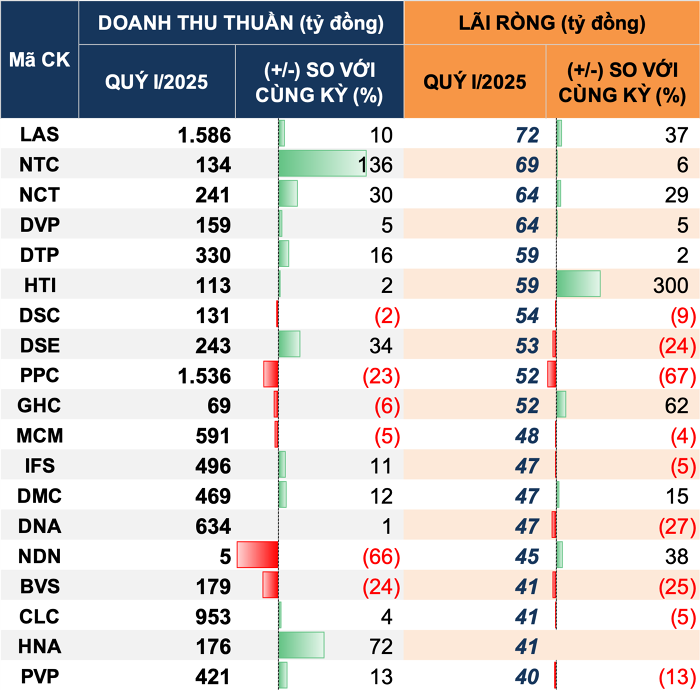 Trái lại, nhiều đơn vị ghi nhận lợi nhuận suy giảm, tập trung nhiều ở nhóm chứng khoán (VND, SHS, HCM, FTS, BSI, DSC, DSE, BVS,...) cùng các doanh nghiệp khác như PGBank (Mã: PGB), Mộc Châu Milk (Mã: MCM), Nhiệt điện Phả Lại (Mã: PPC),...