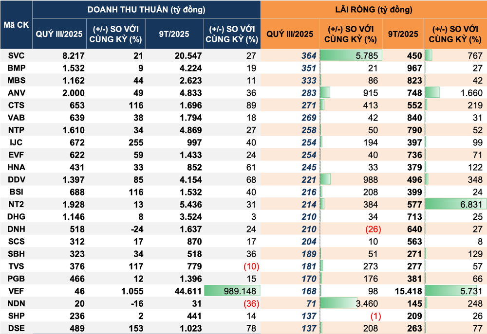 Ngoài ra, nhiều doanh nghiệp cũng báo lãi tăng trưởng hai con số so với cùng kỳ như: Dược Hậu Giang, CTCP Trung tâm Hội chợ Triển lãm Việt Nam (Mã: VEF), Hoàng Anh Gia Lai (HAGL - Mã: HAG), Nhựa Bình Minh (Mã: BMP), Nhựa Tiền Phong (Mã: NTP), Sao Ta (Mã: FMC), CTCP Dịch vụ Hàng hóa Sài Gòn (Mã: SCS),...