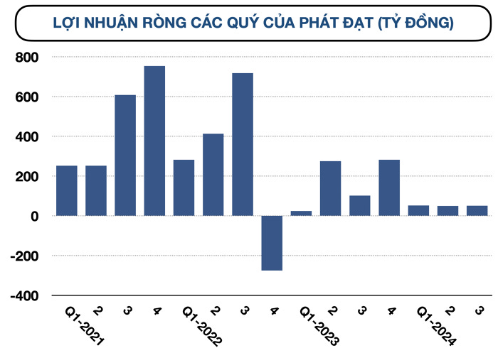 Doanh thu của CTCP Phát triển Bất động sản Phát Đạt (Mã: PDR) chỉ còn chưa tới 3 tỷ đồng quý III, cùng kỳ đạt 355 tỷ trong bối cảnh ngành còn nhiều khó khăn, việc đầu tư và phát triển dự án của công ty chưa thuận lợi. Song nhờ lợi nhuận chuyển nhượng công ty liên kết giúp Phát Đạt ghi nhận khoản doanh thu tài chính 194 tỷ.