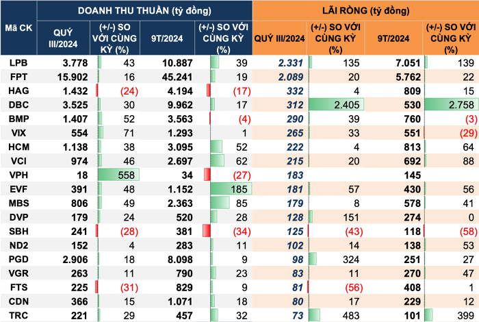 Nhiều doanh nghiệp lớn như LPBank, FPT, Hoà Phát, Dabaco, HAGL, Nhựa Bình Minh, DVP hay MBS, VIX, Chứng khoán DSC,... ghi nhận lợi nhuận tăng trưởng so với cùng kỳ.