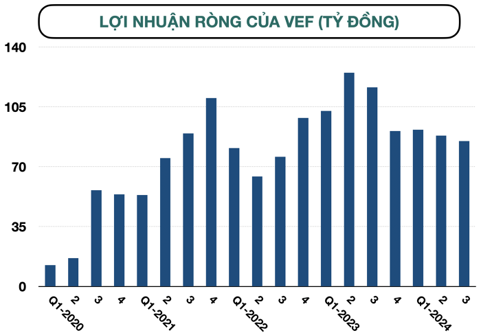 Doanh thu luôn ở mức thấp song nguồn thu chính của VEF đến chủ yếu từ lãi cho vay. Doanh thu tài chính kỳ này giảm 14% so với cùng kỳ còn 129 tỷ do VEF sử dụng nguồn tiền vào hoạt động phát triển các dự án đang triển khai. Trừ đi các chi phí, VEF báo lãi sau thuế gần 85 tỷ, giảm 27% so với quý III năm ngoái.