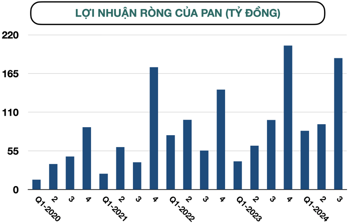 Tập đoàn PAN ghi nhận doanh thu thuần 5.084 tỷ đồng quý III, tăng 37% so với cùng kỳ. Các chi phí (bán hàng, tài chính) đều gia tăng so với cùng kỳ. Song nhờ giá vốn được kiểm soát và đặc biệt là lợi nhuận từ công ty liên doanh liên kết tăng vọt lên từ 2 tỷ cùng kỳ lên 147 tỷ giúp tập đoàn báo lãi sau thuế tăng 78% lên 344 tỷ. Lợi nhuận sau thuế của cổ đông công ty mẹ tăng 89% lên 187 tỷ đồng.