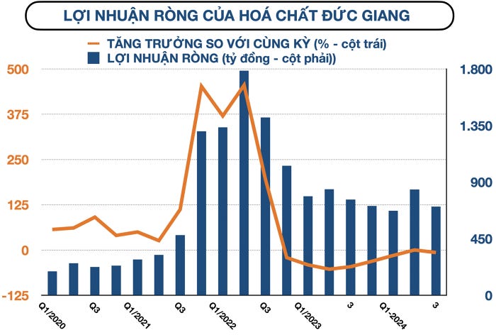 Hoá chất Đức Giang báo lãi ròng 706 tỷ đồng quý vừa qua, giảm 7% so với cùng kỳ năm ngoái dẫu doanh thu tăng 4% lên 2.558 tỷ đồng do hụt thu tài chính và tăng chi phí bán hàng.