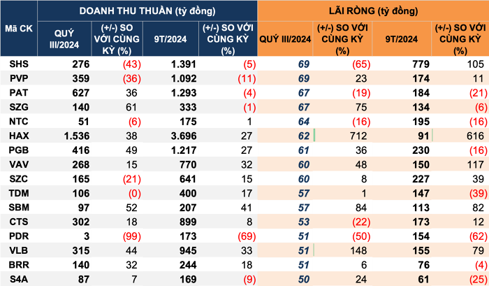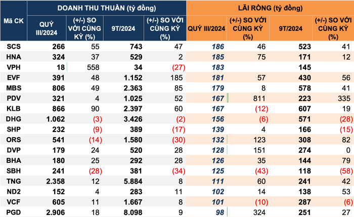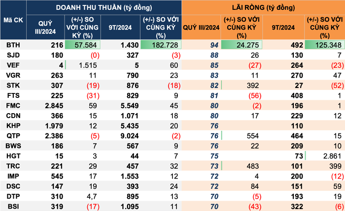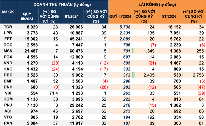 Nhiều doanh nghiệp ghi nhận lợi nhuận sau thuế của cổ đông công ty mẹ (lợi nhuận ròng) tăng trưởng đột biến trên 100% trong quý III như: Tập đoàn Masan (Mã: MSN), LPBank (Mã: LPB), Dabaco (Mã: DBC), Cảng Đình Vũ (Mã: DVP), CTCP Vạn Phát Hưng (Mã: VPH), CTCP Chế tạo Biến thế và Vật liệu Điện Hà Nội (Mã: BTH), CTCP Phân phối khí thấp áp Dầu khí Việt Nam (Mã: PGD), Tổng CTCP Địa ốc Sài Gòn (Mã: SGR),...
